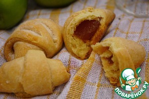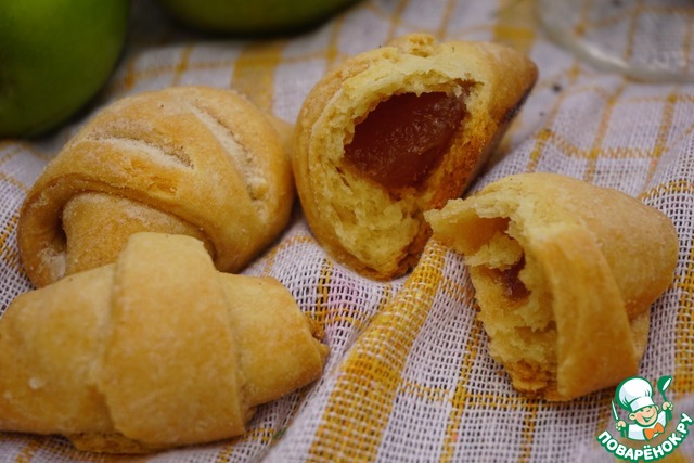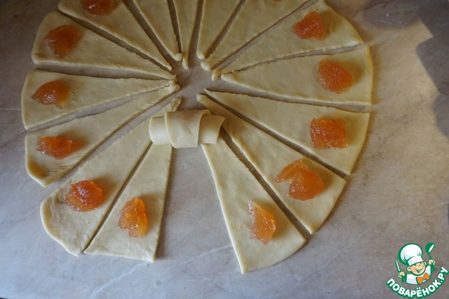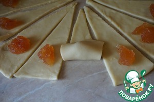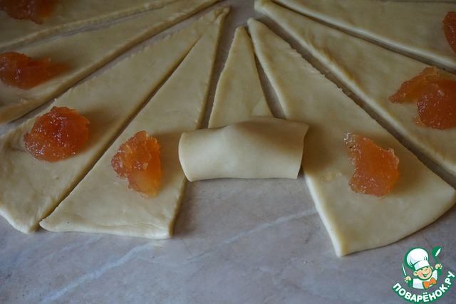 Раскладываем на край каждого треугольника по одной чайной ложке домашнего яблочного повидла (ссылку на рецепт выложу ниже)