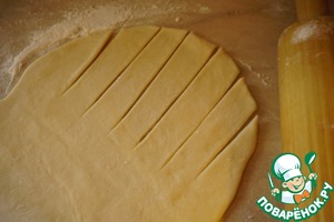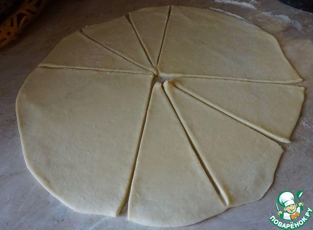 Теперь хочу поделится тремя вариантами формовки рогаликов. Для этого я делю тесто на три части. каждую раскатываем толщиной в в 0,5 см