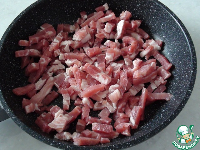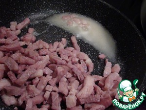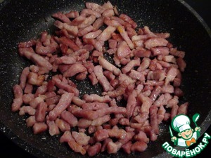 Пока кастрюля закипает, выкладываем на маленькую антипригарную сковородку 150-200 гр. не слишком жирного бекона и на сильном огне быстро обжариваем, ПОСТОЯННО помешивая (иначе сгорит).