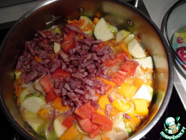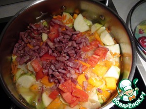 Тем временем наша вода уже закипела или закипает, и мы добавляем румяный бекон в кастрюлю, всё перемешиваем, закрываем крышкой и варим на маленьком огне до мягкости овощей. У меня ушло примерно 40 мин. В процессе варки рекомендуется пару раз перемешать содержимое для более равномерной термообработки.
