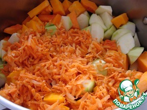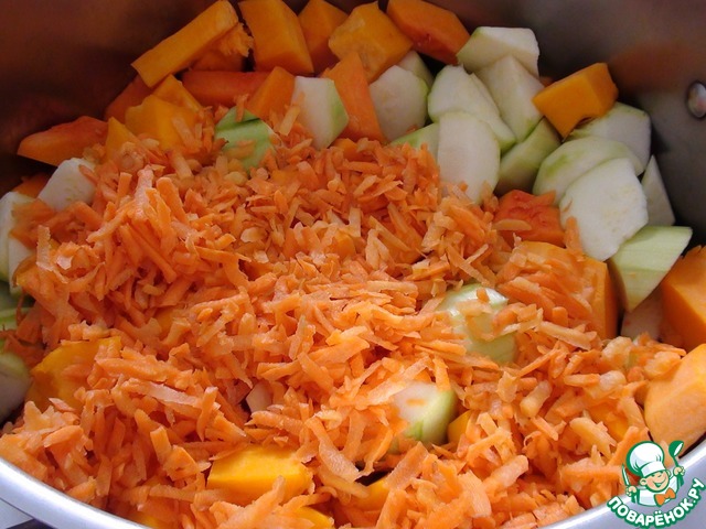 Вот мои твёрдый кабачок "Бютернот" (а может это и не кабачок, а тыква, потому что мякоть оранжевого цвета?) и маленькая толстенькая оранжевая тыковка "Потимарон". Эти овощи почистить и порезать небольшими кусочками. Также почистить и порезать кусочками побольше кабачки "Цуккини". Они мягкие и времени на их варку потребуется меньше, вот почему их лучше нарезать покрупнее.