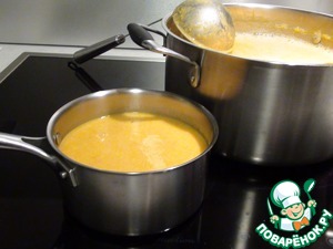 Теперь берём маленький сотейник (у меня на 7 половников), ставим рядом с кастрюлей, наливаем туда немного супа из большой кастрюли (примерно 5 половников) и измельчаем погруженным блендером в почти гладкую однородную массу. Только в маленьком ковшике можно добиться необходимой гомогенной консистенции, а в большой кастрюле это почти невозможно. Я всегда так готовлю любые супы-пюре. И уж тем более те, которые с кусочками бекона.