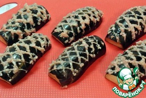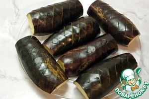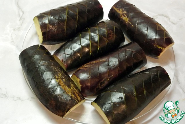 Баклажаны вымыть, обсушить, удалить плодоножки и разрезать вдоль на 2 части. Уложить разрезанной стороной вниз, с двух сторон положить ограничители, чтобы не прорезать мякоть до конца. Ограничителями могут быть деревянные шпажки, крышки, ножи. Надрезать баклажаны на полоски по диагонали, не прорезая насквозь. Делать надо аккуратно, иначе баклажаны развалятся, нужного эффекта не получится.