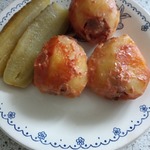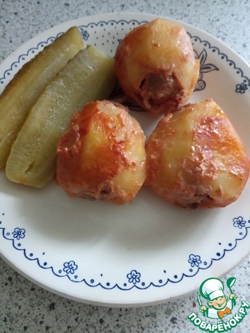 3. Фаршируем подготовленный картофель фаршем. Перекладываем в глубокую жаропрочную форму.