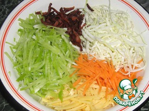 Сыр, редьку, морковь, капусту нарезать соломкой.