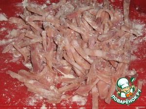 Ветчину нарезать тонкой соломкой, обсыпать мукой.