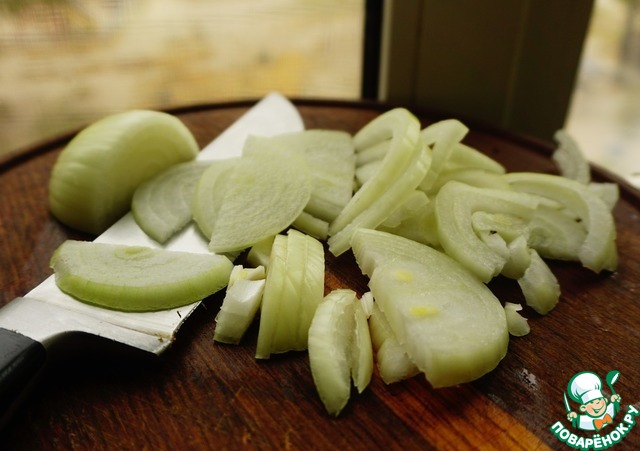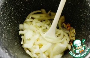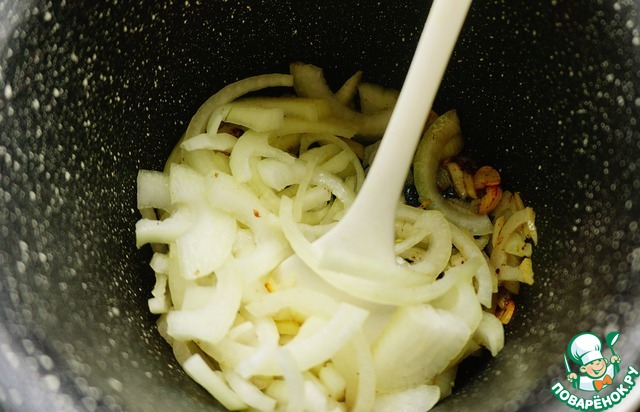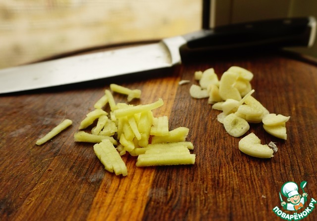 Немного прожариваем вместе с луком, чесноком и имбирем.
