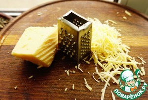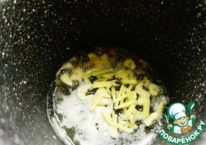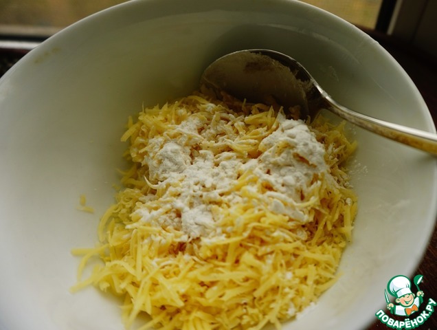 Смешиваем его с крахмалом. Крахмал тут нужен, чтобы сыр лучше растворился в супе и мы получили тягучую структуру супа.