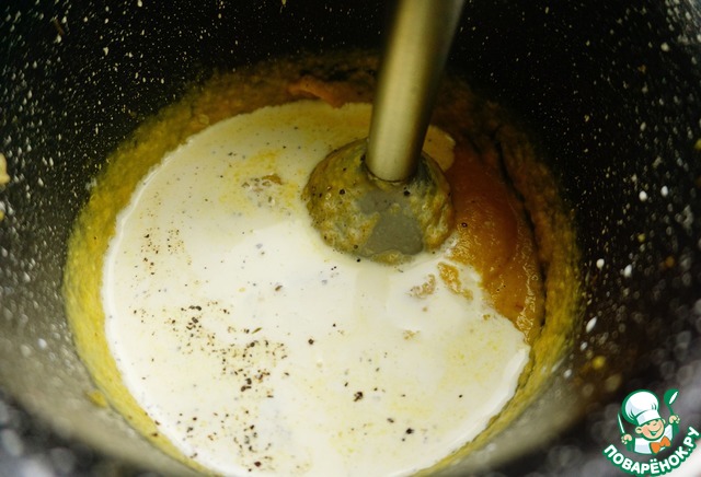 Вливаем сливки, еще раз перебиваем. Возвращаем сотейник на огонь, добавляем сыр и перемешиваем венчиком. Тут все нужно было делать быстро, поэтому шага соединения сыра и супа сфотографировать не удалось. Но, надеюсь и без фото все понятно.