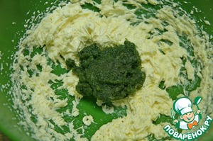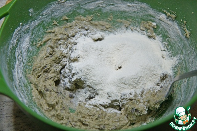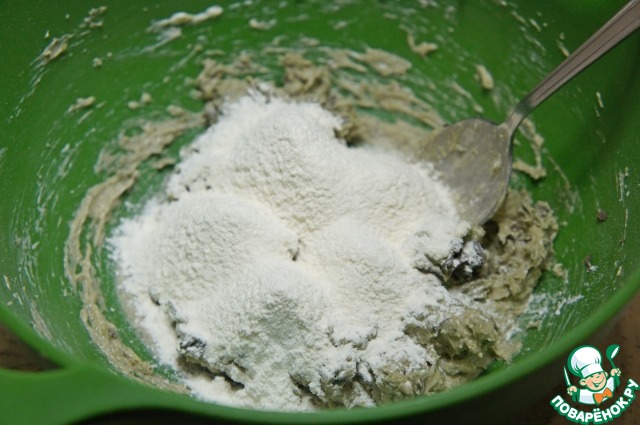 • Муку смешать с разрыхлителем и просеять в масляную смесь.