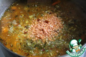 Залить все содержимое бульоном, добавив все приправы и чечевицу. Накрыть и томить до готовности.