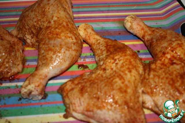 У меня было время и желание и поэтому я натерла окорочка солью, перцем, паприкой, сухим чесноком и маслом. Дать промариноваться около часа и запечь до готовности. -