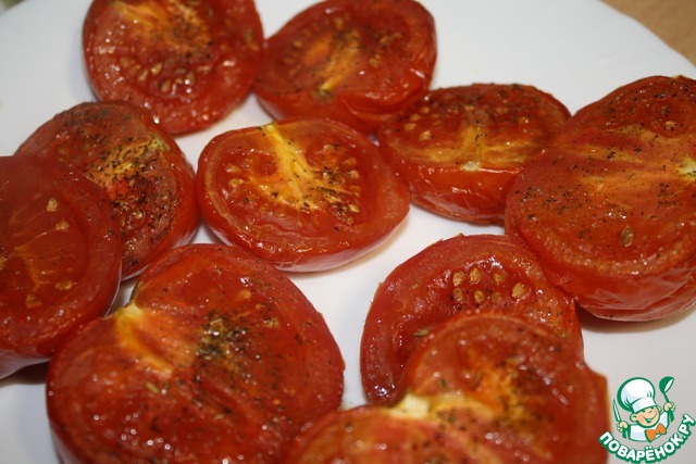Помидоры разрезать пополам, присыпать солью и сахаром. Можно посыпать любимыми травками. У меня был чабер.