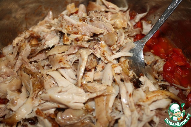 Если хотите более густой вариант блюда, то запеченые окорочка заливают помидорно-перечной массой, добавляют чуток воды и так же добавляется чеснок и петрушка, запекается все около 25 минут. -