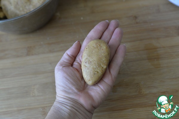 Делим "тесто" на кусочки по 50 гр. Каждый кусочек раскатываем руками в продолговатый шарик, слегка расплющиваем и заостряем один конец.