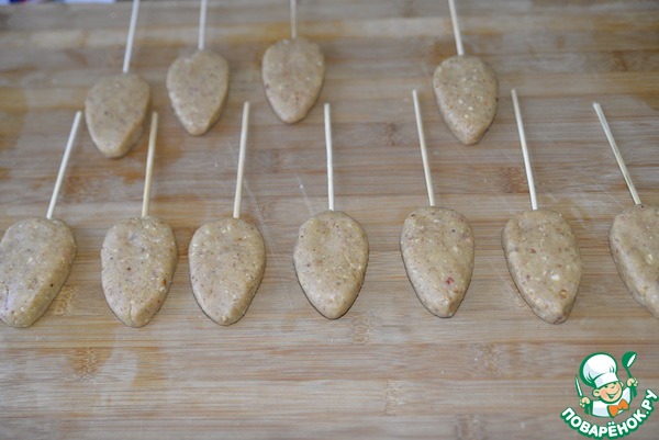 Берём палочки (шпажки). В широкий конец вставляем палочку. У меня получилось 11 штук. Кладём заготовки на доску, покрытую фольгой, и ставим в морозилку минимум на 1 час.