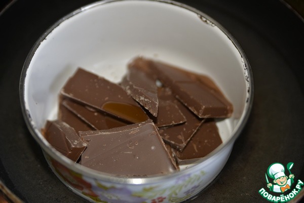 Готовим глазурь. В миску ломаем шоколад, ставим на водяную баню, добавляем растительное масло, хорошо перемешиваем до однородного состояния.