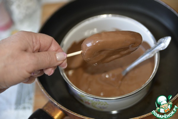 Достаём из морозилки заготовки "мышек", опускаем в шоколад. Быстро равномерно покрываем шоколадом, помогая ложкой. Слегка стряхиваем избытки шоколада, постукивая по миске.