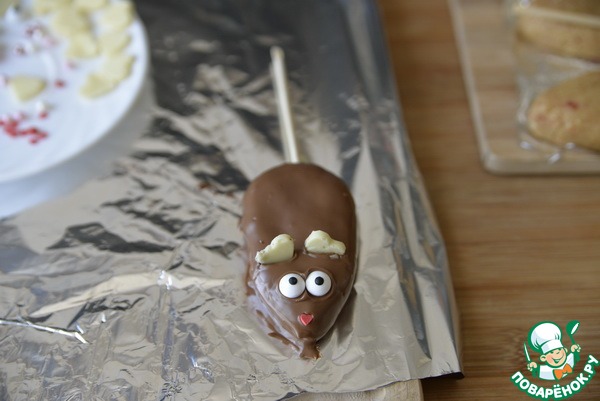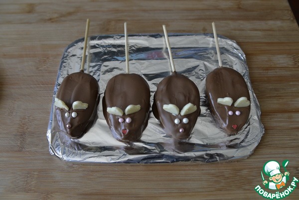 Кладём "мышку" на доску, покрытую фольгой, вставляем ушки из белого шоколада. С помощью пинцета размещаем глаза и ротик. Делаем это, пока не застыл шоколад.