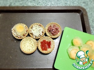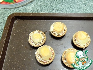 На дно тарталеток разложить по щепотке сыра.