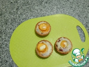 Вынув тарталетки из духовки, в центр желтка положить по маленькому кусочку сливочного масла.