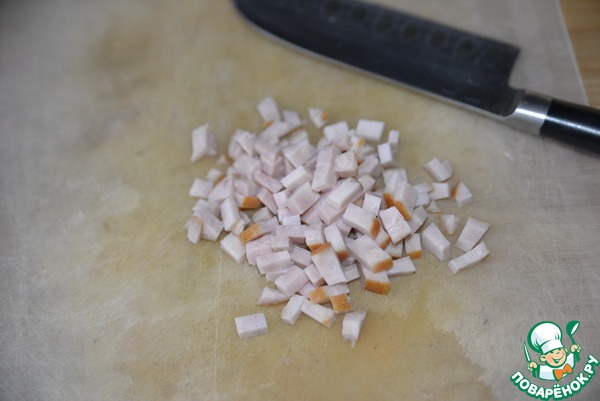 Берём блюдо (тарелку) для подачи, кладём кулинарное кольцо. Лук отжимаем и кладём на дно. Далее мелко режем кубиками ветчину, у меня куриная, и кладём сверху лука. -