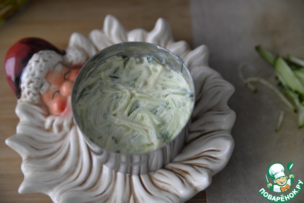 Огурец натираем на тёрке, кладём сверху ветчины и смазываем майонезом.