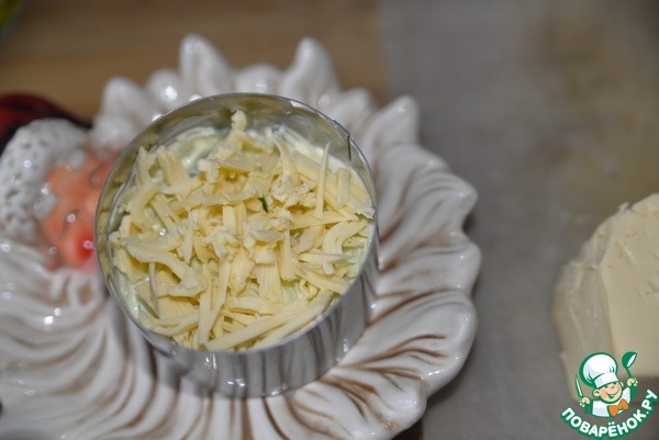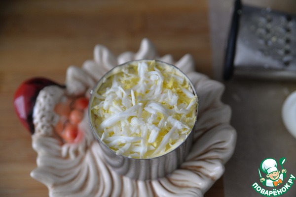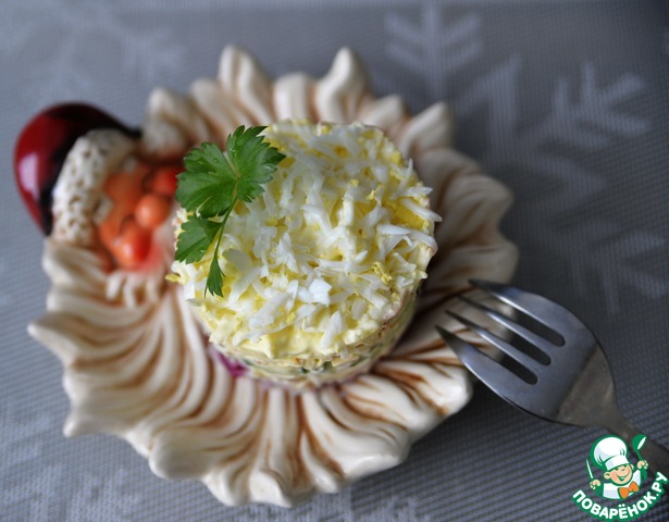 Так как это салат слоёный, то для подачи лучше брать разъёмную форму или делать порционную подачу с помощью кулинарного кольца.