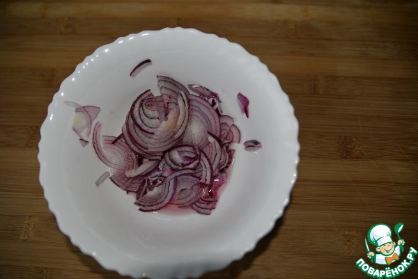 Красный лук режем тонкими полукольцами, добавляем соль, сахар, уксус и отставляем мариноваться на 15 минут.