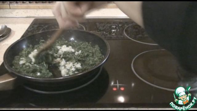 Когда шпинат станет мягким, добавляем к нему обжаренный лук, посолим, поперчим. Добавляем 1 ст. л. муки, перемешаем, 1 минуту подержим на сковороде и снимаем. Даем немного остыть.