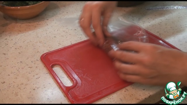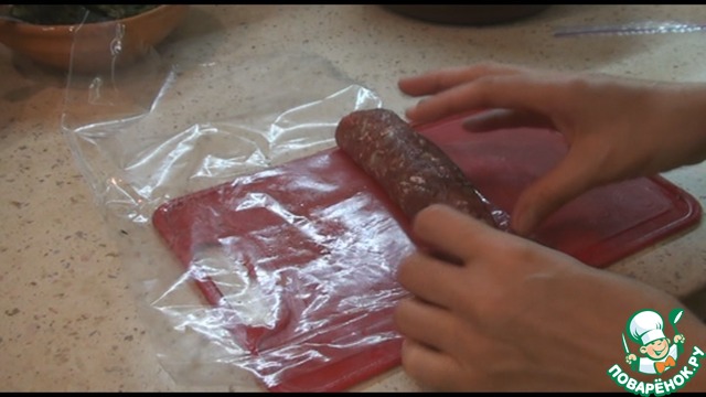 С помощью пленки заворачиваем рулет, прижимая немного руками. Края подворачиваем, чтобы сыр меньше вытекал при запекании.