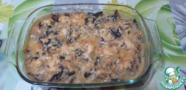 После загустения соуса, перекладываем содержимое сковороды в противень, посыпаем сыром и ставим в разогретую духовку до 180 градусов. Дожидаемся румяной сырной корочки и подаём на стол, что бы насладиться этим потрясающе нежным блюдом. Всем приятного аппетита друзья)