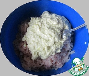 Сливочно-луковую смесь добавляем в куриный фарш, солим и перчим, тщательно вымешиваем и убираем в холодильник на срок от 30 до 90 минут.