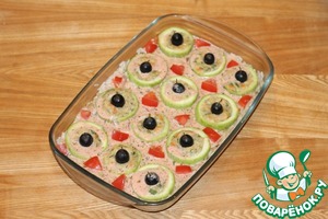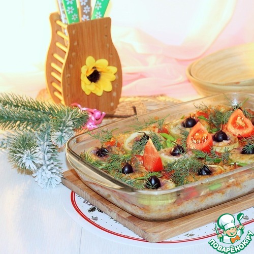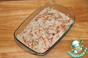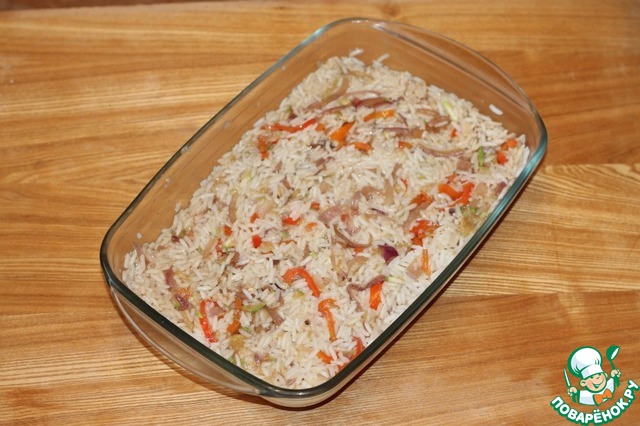 • 13. Заливаем рис соусом, украшаем дольками помидора. Накрываем формочку фольгой и отправляем в разогретую духовку до приготовления блюда.