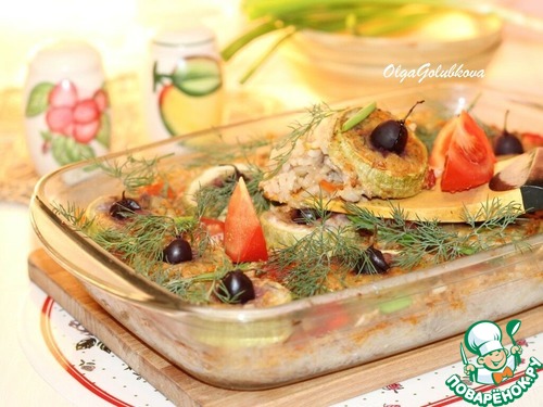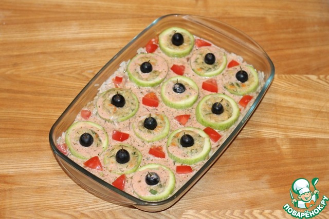 • 11. Кладем на рис кружочки кабачка и заполняем их фаршем. Сверху украшаем крупным виноградом "Изабелла".