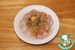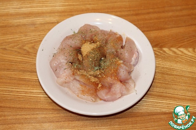 Приготовим куриный фарш. Куриное филе порезать кусочками, посыпать приправой и измельчить в мясорубке.