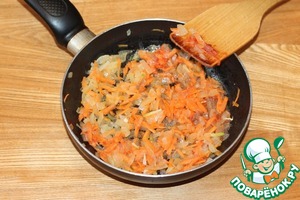 • 2. Разогреть сковороду с добавлением растительного масла (1 ст. л.) и выложить порезанные лук (1 шт) и морковь (1 шт). Тушить на небольшом огне 5 минут.