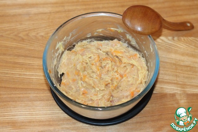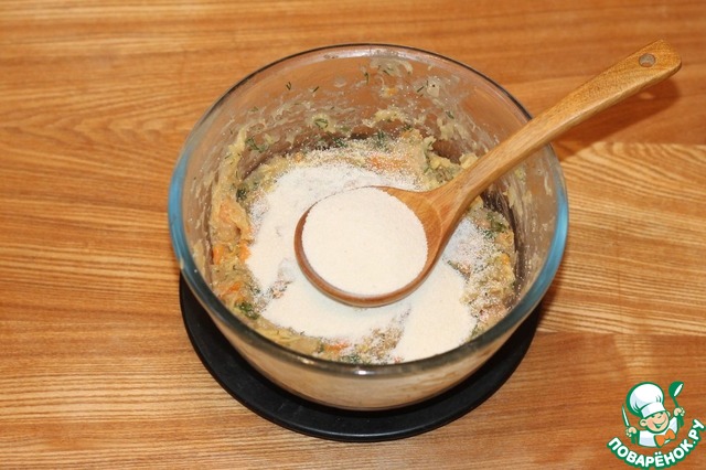 • 5. По 1 ст. л. вмешать манную крупу, посолить по вкусу и тщательно все вымешать.