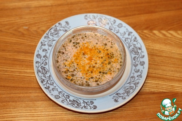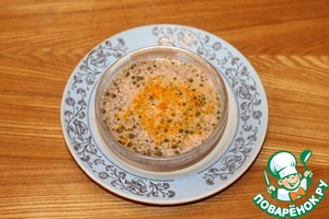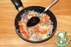 • 12. Приготовим заливку. Смешиваем бульон (или воду) с 1 ст. л. растительного масла, сметаной, томатным кетчупом и приправой, солим и перчим.