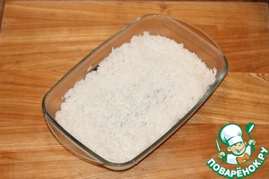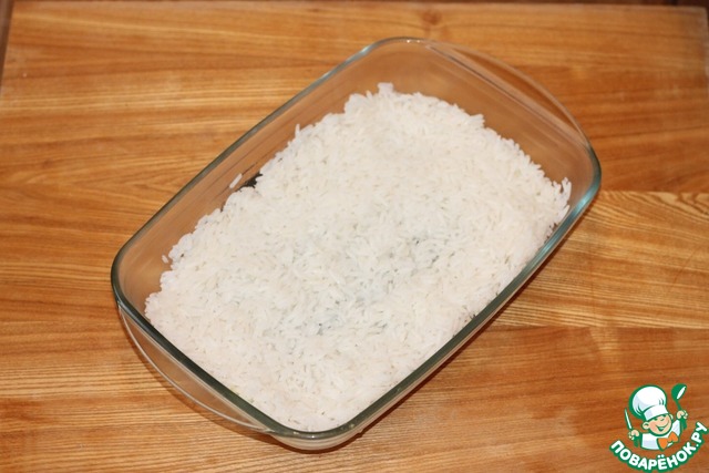 • 9. Выкладываем рис в смазанную растительным маслом формочку для запекания.
