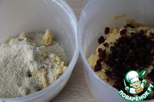 Разделить тесто пополам. В одну часть добавить миндальную муку, во вторую - клюкву (лучше ее измельчить ножом)