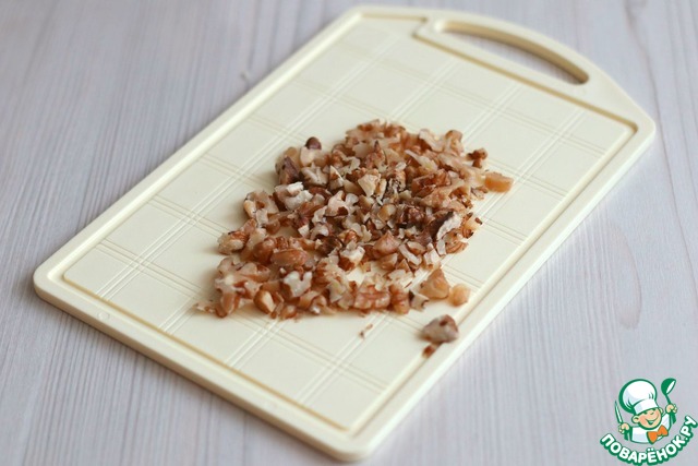 Грецкие орехи (1 горстка) промыть, подсушить в духовке, затем нарезать не крупными кусочками.