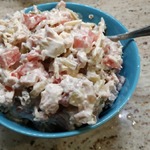 Все составляющие салата добавить в миску, добавить по вкусу майонез, при необходимости добавить соль.