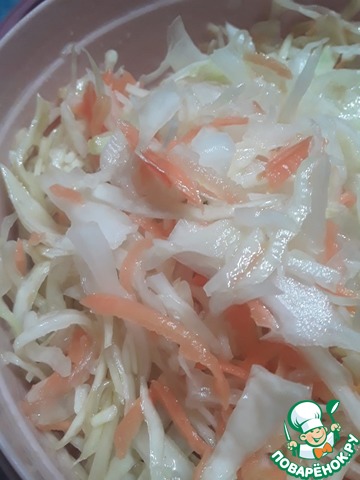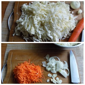 Капусту шинкуем произвольно, как вы любите. Морковь натираем на тёрке, лук режем полу-кольцами, зубчик чеснока-слайсами.