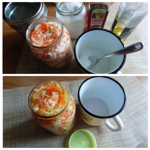Делаем рассол. В эмалированную посуду выкладываем сахар, соль. Заливаем кипящей водой из чайника 0,5 л, перемешиваем, ставим на огонь, наливаем масла подсолнечного и уксус. Доводим до кипения и заливаем капусту. Капуста утрамбована и воду легче залить в неё, используя ложку с длинной ручкой или вилку. Постепенно наливать воду и ложкой прокалывать слой капусты до дна. Уйдут все пол-литра рассола, ну если чуть останется. У меня на фото видно, осталось пара ложек рассола. Закрыть пластмассовой крышкой и поставить на тарелку остывать. Такую капусту я делаю с вечера, утром она готова к употреблению.