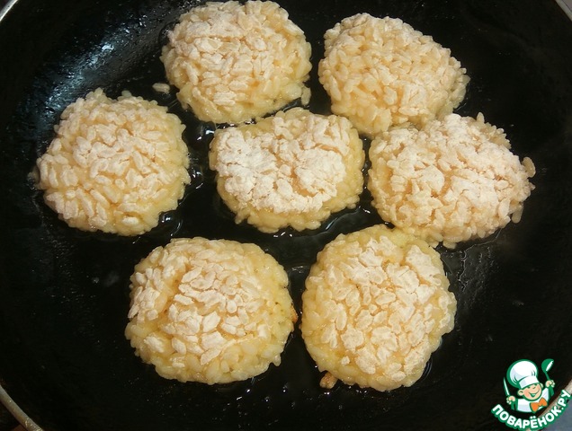 Приплюснуть, формируя биточки и выложить в хорошо разогрею сковороду с растительным маслом.