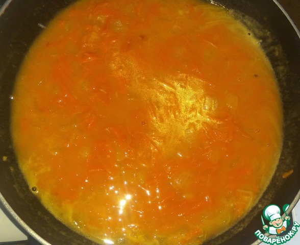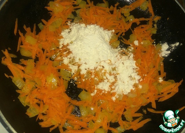 На растительном масле поджарить до прозрачности лук, добавить морковь. Жарить до мягкости моркови. Добавить 1 ст л муки, перемешать. -