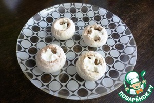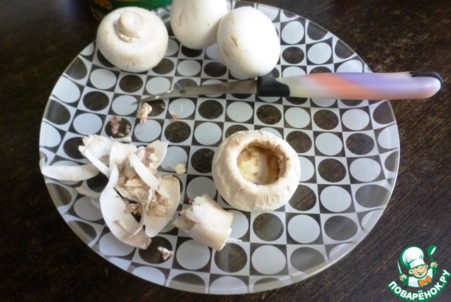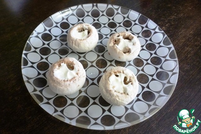 Со шляпок грибов снять верхнюю шкурку. Снимается она легко, стоит только подцепить ножом краешек. Ножку выкрутить, чайной ложкой выбрать остатки, чтобы получилась чаша.
