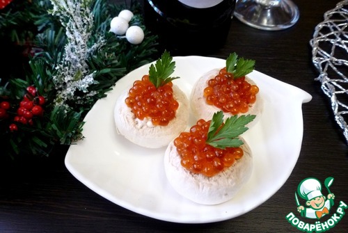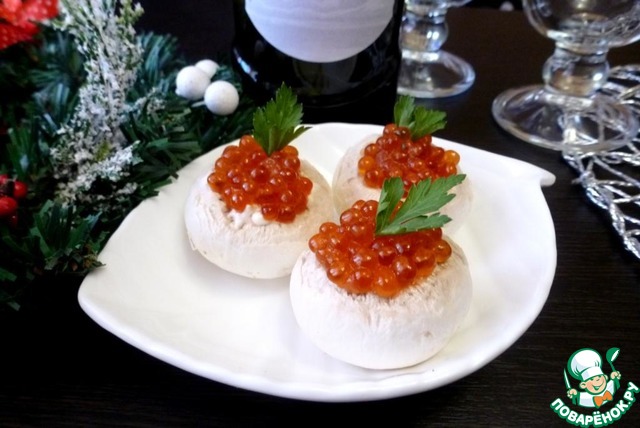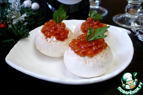 Ни одно застолье не обходится без закусок. Я предлагаю оригинальную закуску из сырых шампиньонов с красной икрой. Готовится она быстро и если вдруг гости нежданно нагрянут, то на её приготовление нужно всего несколько минут. Еще это отличный вариант для банкета.