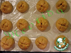 противень застилаем бумагой длф выекания или фольгой, смазываем хорошенько маслом и выкладываем тесто, сформировав из него небольшие шарики (потом каждый шарик можно сверху слегка надрезать кухонными ножницами)